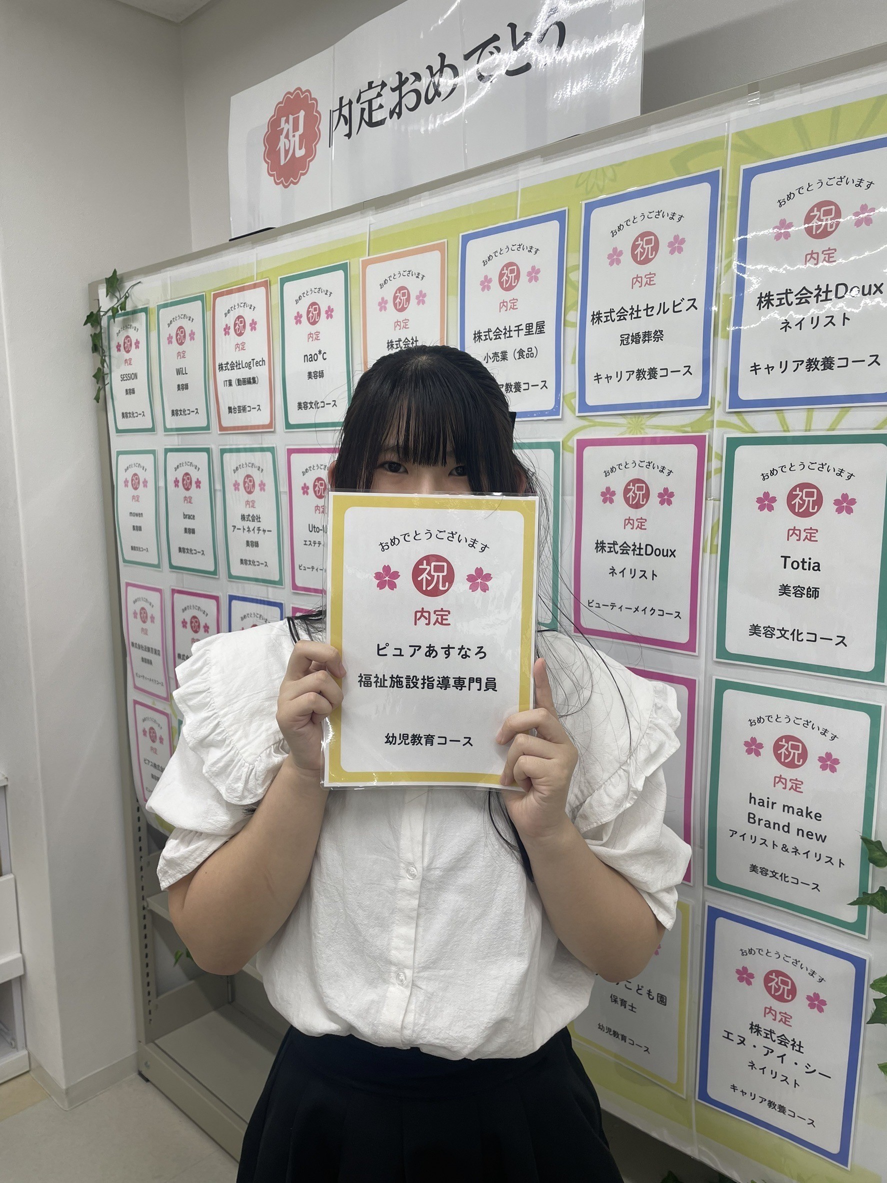 幼児教育コースの村田 実優さんが、「ピュアあすなろ(福祉施設指導専門員)」さまで内定を獲得しました!
