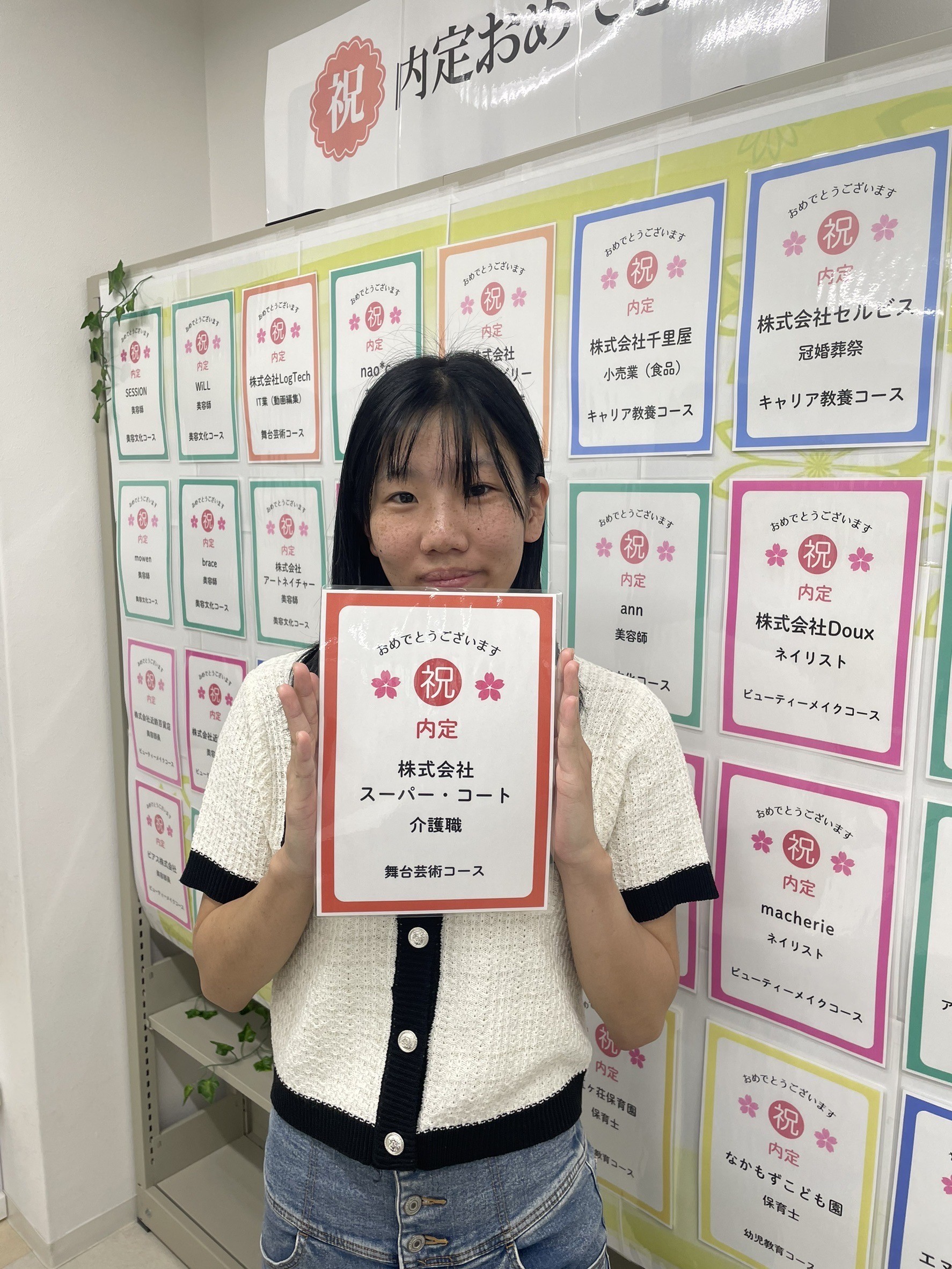 舞台芸術コースの成重 萌美さんが、「株式会社スーパー・コート(介護職)」さまで内定を獲得しました!
