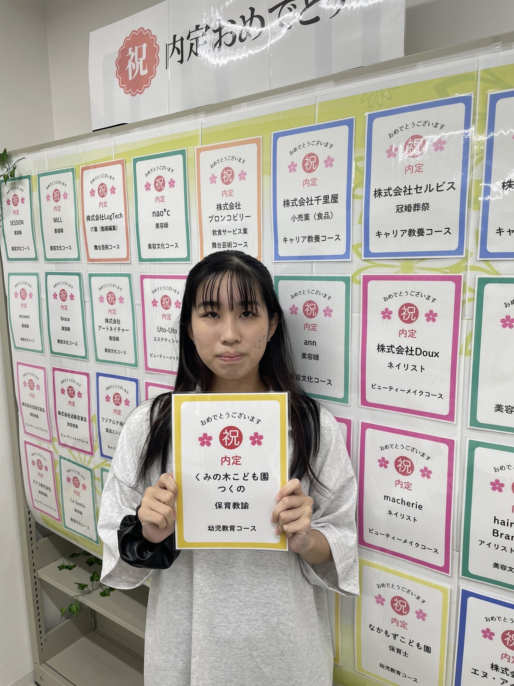 幼児教育コースの白山 優羽さんが、「くみの木こども園つくの(保育教諭)」さまで内定を獲得しました!