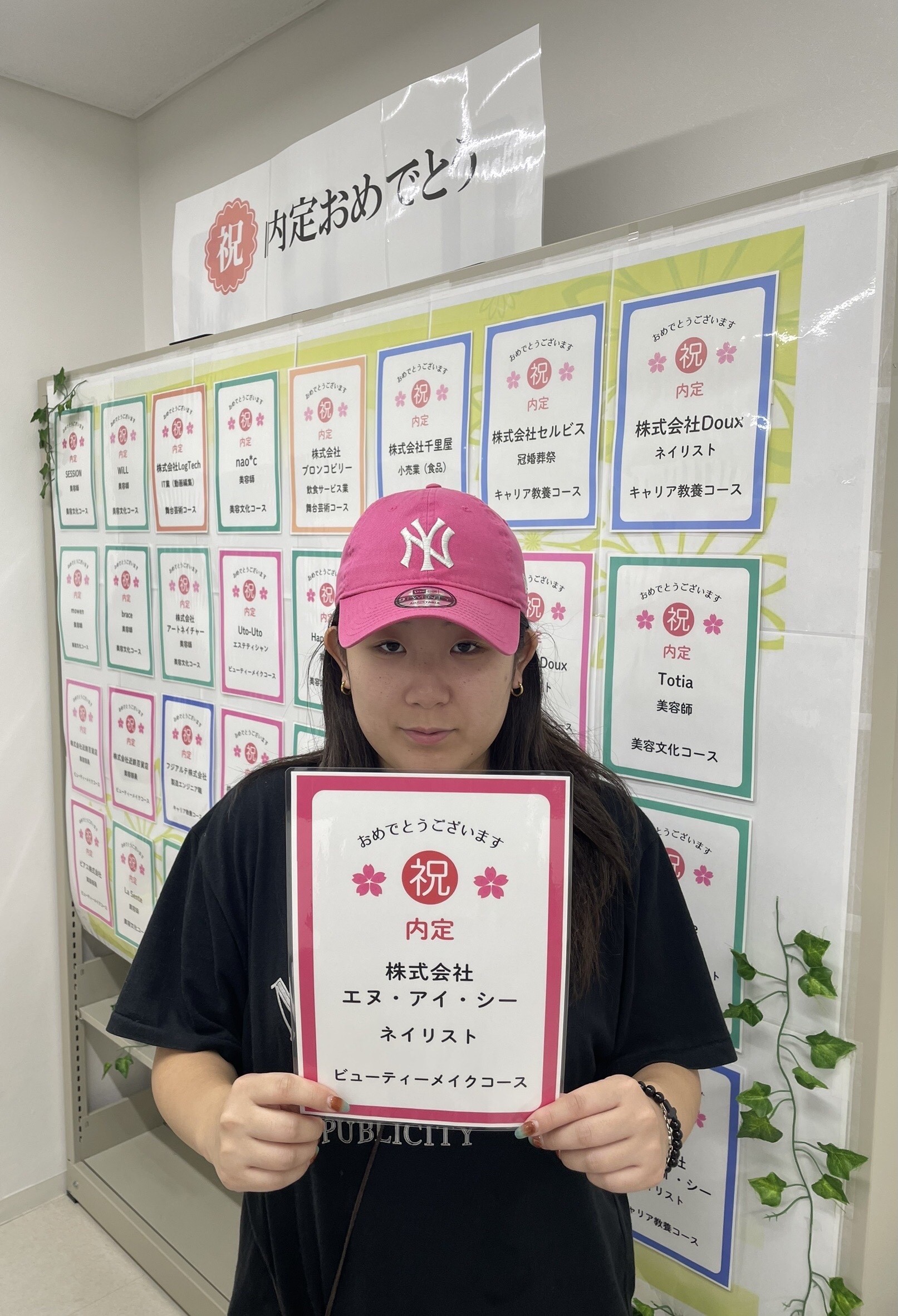 ビューティーメイクコースの藤木 果希さんが、「株式会社エヌ・アイ・シー(ネイリスト)」さまで内定を獲得しました!